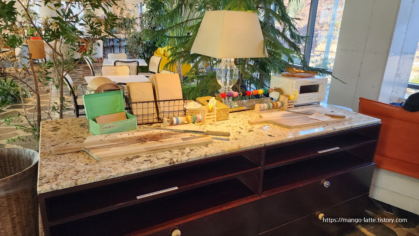 일산 베이커리카페 빠르끄 3층에 빵을 자를 수 있는 공간도 아기자기하게 마련되어 있어요.