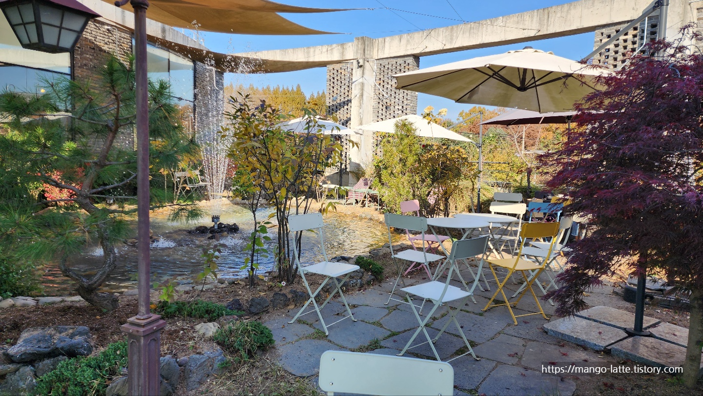 일산 맛집 빠르끄 2층의 분수대 옆으로 분위기있는 테이블과 의자들이 즐비해 있어요.